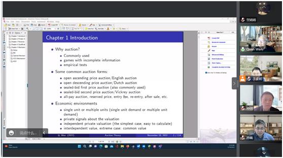 华盛顿大学经济系教授温泉应数量经济系邀请,为我院师生带来两场学术盛宴。讲座由数量经济系孙巍教授主持,数量经济系部分教师、研究生和本科生参与了学术活动。第一场讲座题目为“Auction theory”,围绕“The results of classical auction theory”的主题,温泉教授首先介绍了“Auction theory”的基本内容,从 “Why auction”、“Some common auction forms”和“Economic environments”三个方面展开。此外,温泉教授详细介绍了常见的拍卖模型“Private value auctions”,从模型的基本假设入手,介绍了模型的设定、具体形式并展示了最后结果。第二场讲座是第一场讲座内容的实证应用,围绕温泉教授发表的文章展开。这篇文章以我国各大城市车牌分配限制方式不同为背景,对广州汽车牌照hybrid分配方式进行分析,基于现实数据进行模型设定和均衡分析,探讨“auction-lottery hybrid mechanism”是否可以兼顾效率和公平。两场讲座中,温泉教授详尽讲述了理论知识和实践应用两部分,极大的激发了大家钻研理论并付诸实践应用的科研热情。讲座过程中,温泉教授与我院师生进行了深入的讨论和交流,为师生们提供了更广阔的科研思路和有益的学术指导。