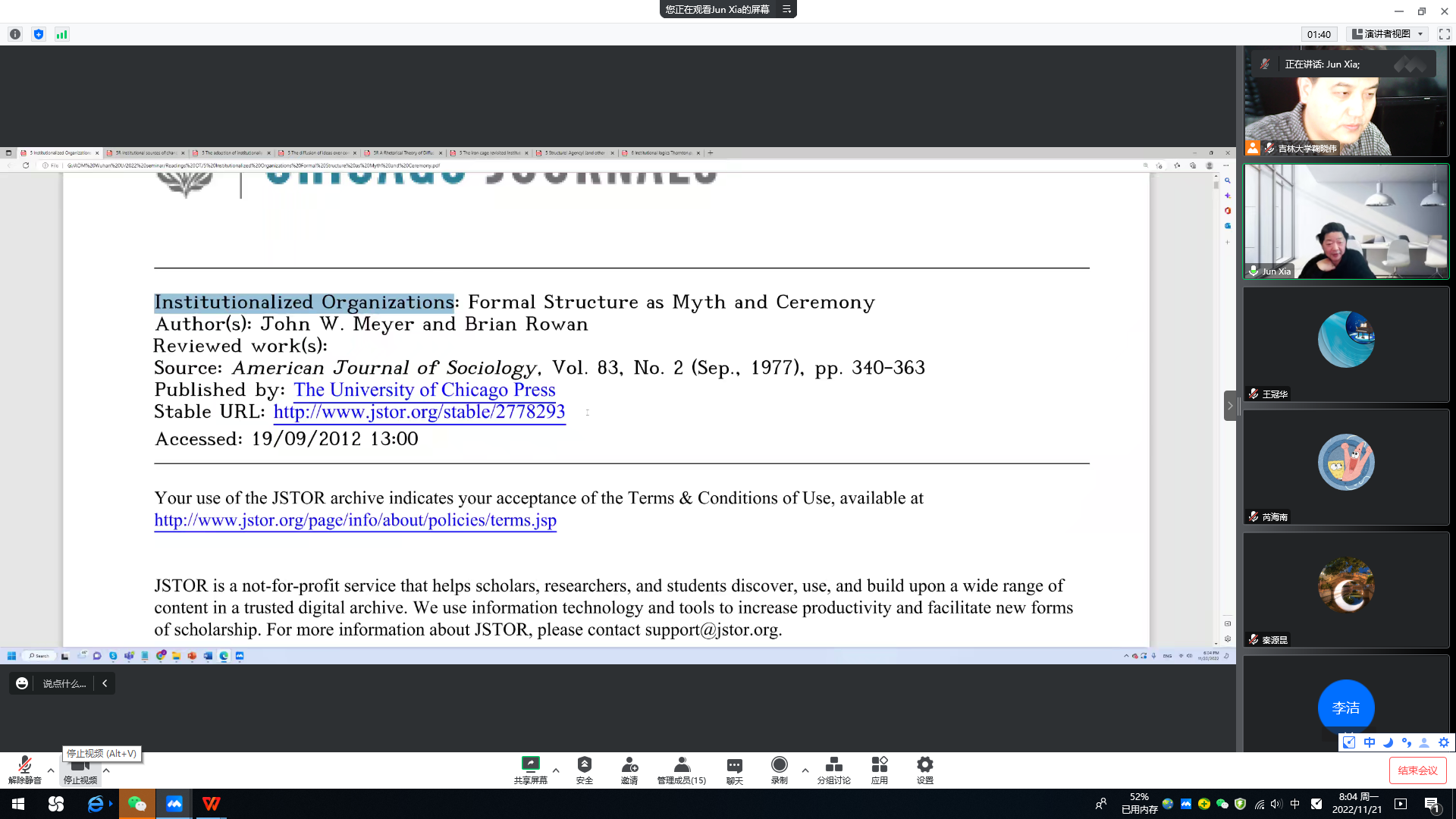 第一场讲座题为“Institutional theory: isomorphism”讲座。讲座主要围绕“Institutional theory: isomorphism”的主题展开。首先,夏军教授介绍了制度理论的来源,以及制度化组织的含义,即采用外来结构要素的组织。文章中常见的Formal structure也是采用外来某种方式的组织。比如,Rationalized institutional rules是组织采用其他组织的惯例,然后使其成为合法性的一部分,对外部显示出它是合理的。此外,检验制度理论需要检验数量sheer number。例如,以Tolbert和Zucker(1983)这篇文章为例,在Diffustion的过程中,如果企业强行采用,那么过了40年,制度化会达到100%;如果企业自愿采用,那么过了50年,制度化会达到60%。在社会现代化过程中,也会产生很多新的制度要素,企业也会采用这些要素。比如,中国私有制的diffusion。最后,夏军教授介绍了制度改革的六个阶段:precipitating jolts、deinstitutionalization、pre-institutionalization、theorization、diffusion和re-institutionalization。