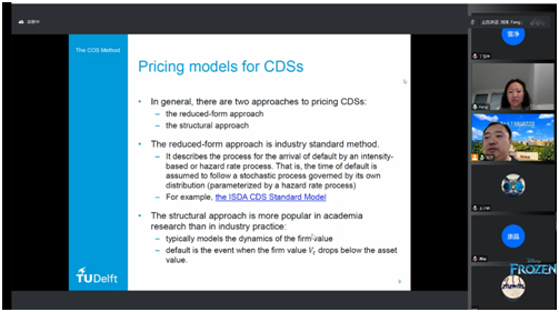 第五十三场讲座由应用金融系承办,邀请到了荷兰代尔夫特理工大学应用数学系方芳博士进行分享交流。讲座由应用金融系刘洋副教授主持,应用金融系的各位老师、研究生及本科生参加了本次讲座。方芳博士不仅在科研上有丰富的学术成果,在金融领域也有着丰富的从业经验。本次讲座,她为大家带来的题目是“Credit Default Swaps and its pricing using the COS method”。本次报告的主要内容是COS方法在信用违约掉期(CDS)中的应用。与前两次讲座相比,本次讲座的风格依然是由浅入深,但内容更为深入。分享结束后,参会老师与方芳博士进行了深入交流。本次报告的技术性很强,启发了相关领域的研究思考,也为同学们强化了金融市场知识掌握。至此,方芳博士系列讲座第三场圆满结束。