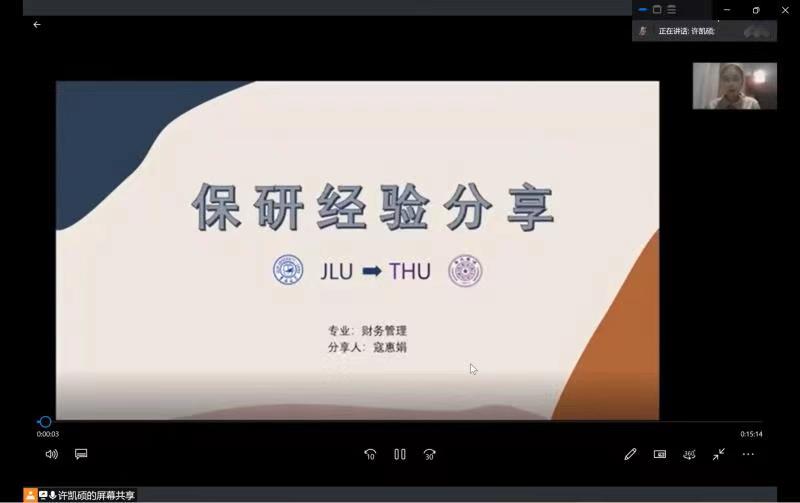 2019级成功保研的寇惠娟同学、康炙阳同学、赵晗同学、王睿熙同学、韩洋煜同学、孙泽文同学、马鸿泽同学和张健琛同学。会议分为两个部分,一是学长学姐进行经验分享,二是同学们的提问环节。