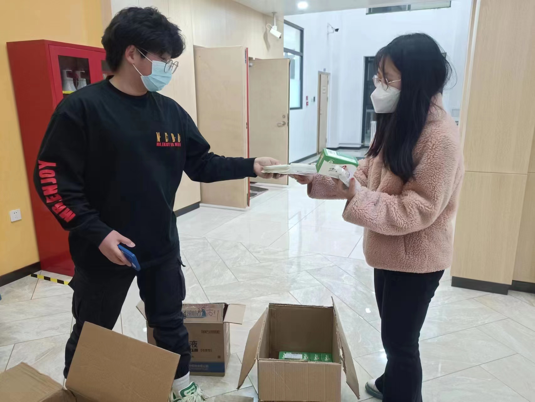 社会当前疫情形势严峻,在了解到社会外备物资稀缺、购买困难,而在校同学疫情环境不稳定的情况后,副校长蔡立东、党委书记赵军等学院领导、老师在第一时间联系了社会各企业、医院及药店,积极沟通协调,购买口罩、消杀用品等疫情防控重点保障物资,极力保障在校学生的防疫物资需求。学院上下齐心协力、全力配合。经多方筹措,学院成功为在校学生筹措防疫物资,共筹集N95口罩4000余个、酒精喷雾800余瓶、消毒湿巾800余包。并逐一分发至各学子手中。
