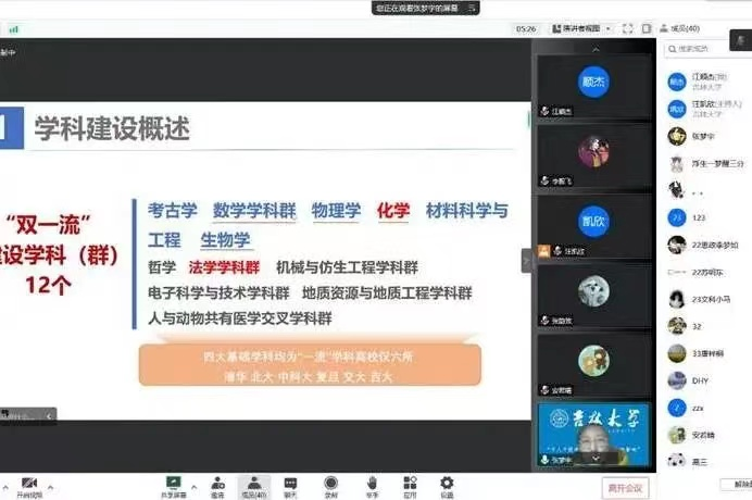 人才辈出”“招生情况”“校园生活分享”“学习经验分享”六个部分对吉大展开了全面具体的介绍和展示,并通过腾讯会议聊天框实时回答同学们的问题,取得了不错的反响。