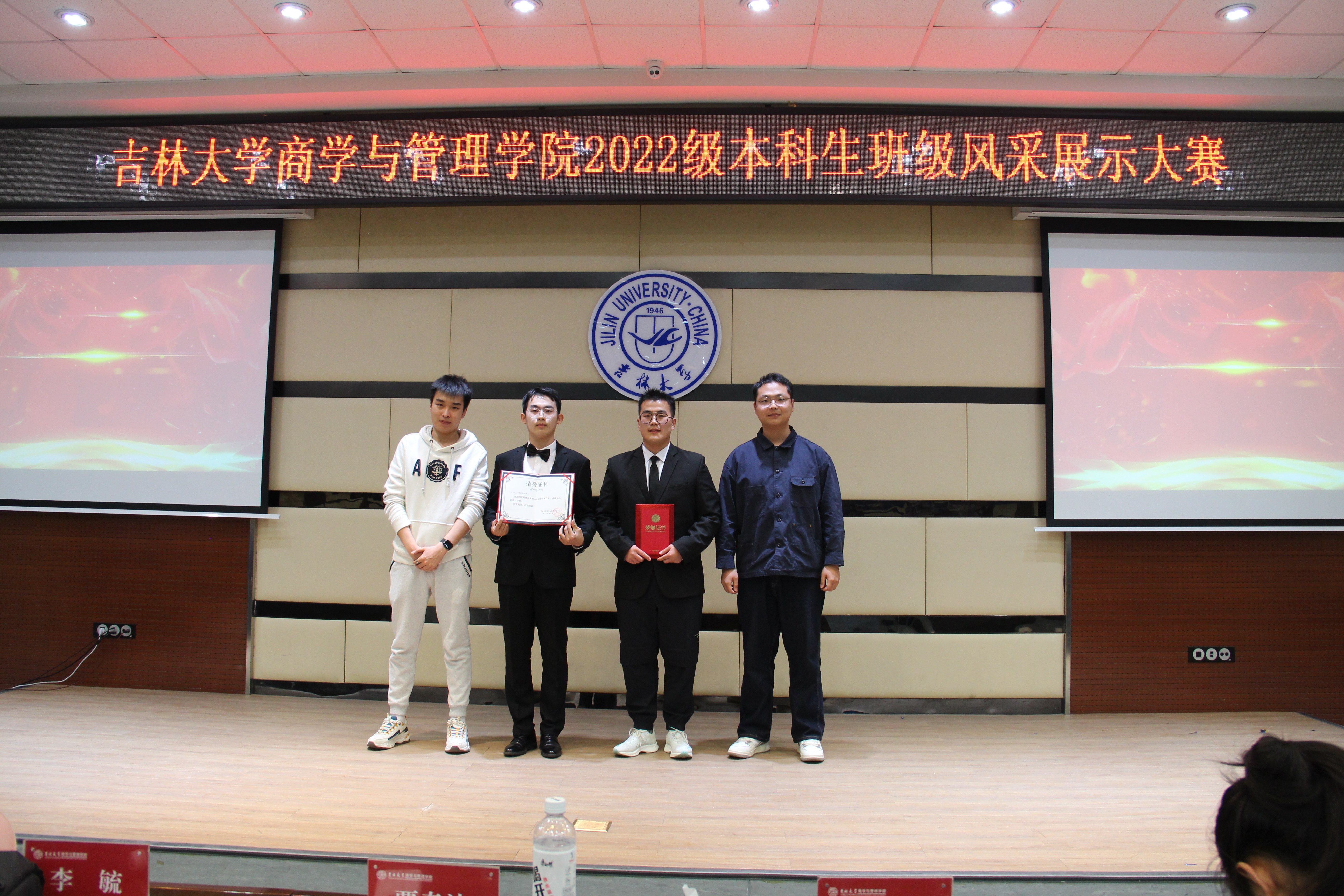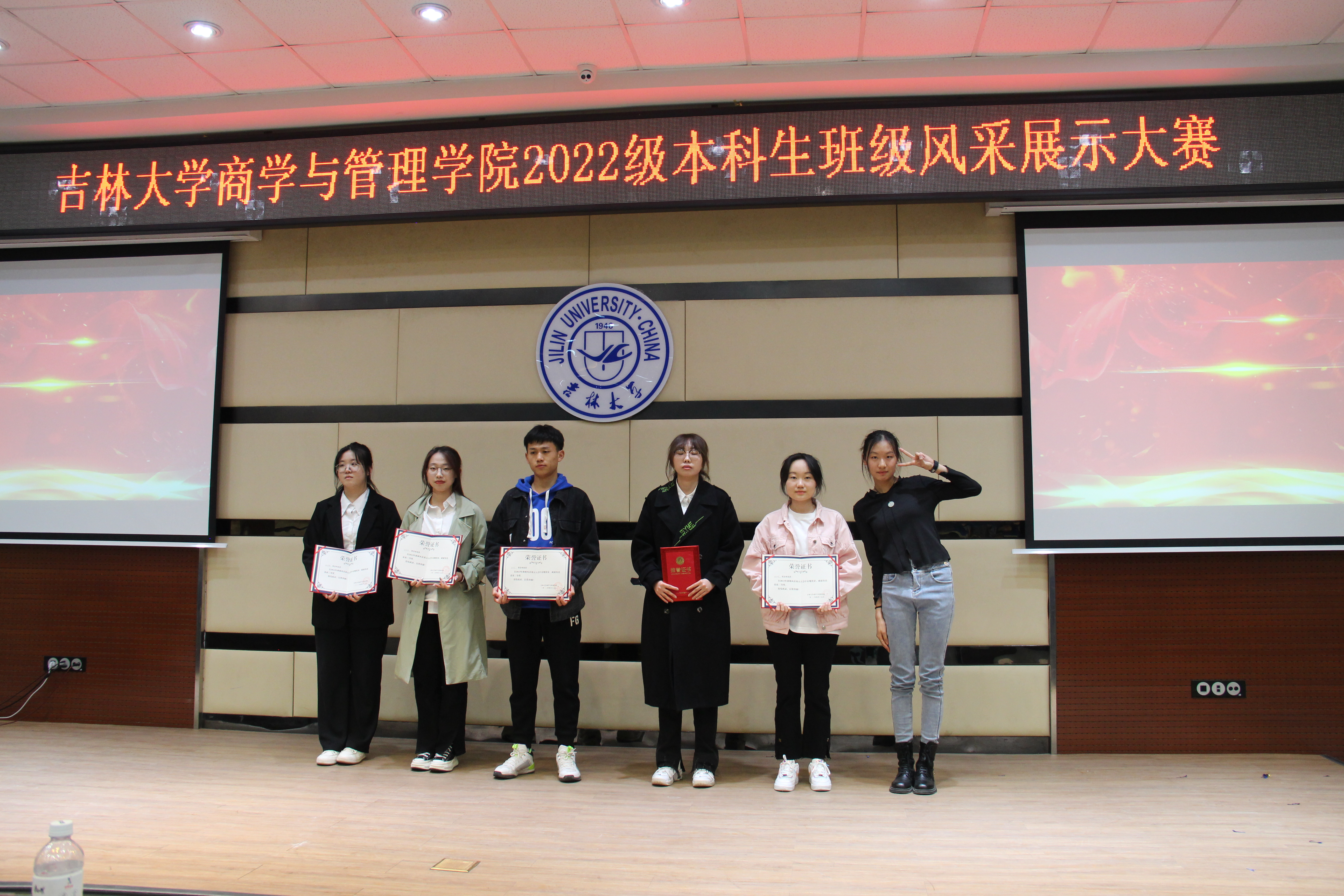 展示结束后,李毓老师和贾奇达老师对比赛进行了点评,老师对同学们的表演给予了积极的肯定,细心地做出了评价,并送出了期望与祝福。最后就是激动人心的颁奖环节:一等奖为1班、9班,二等奖为23班、21班、26班、15班,三等奖为16班、3班、25班、24班、6班、5班。至此,本次风采大会圆满结束。