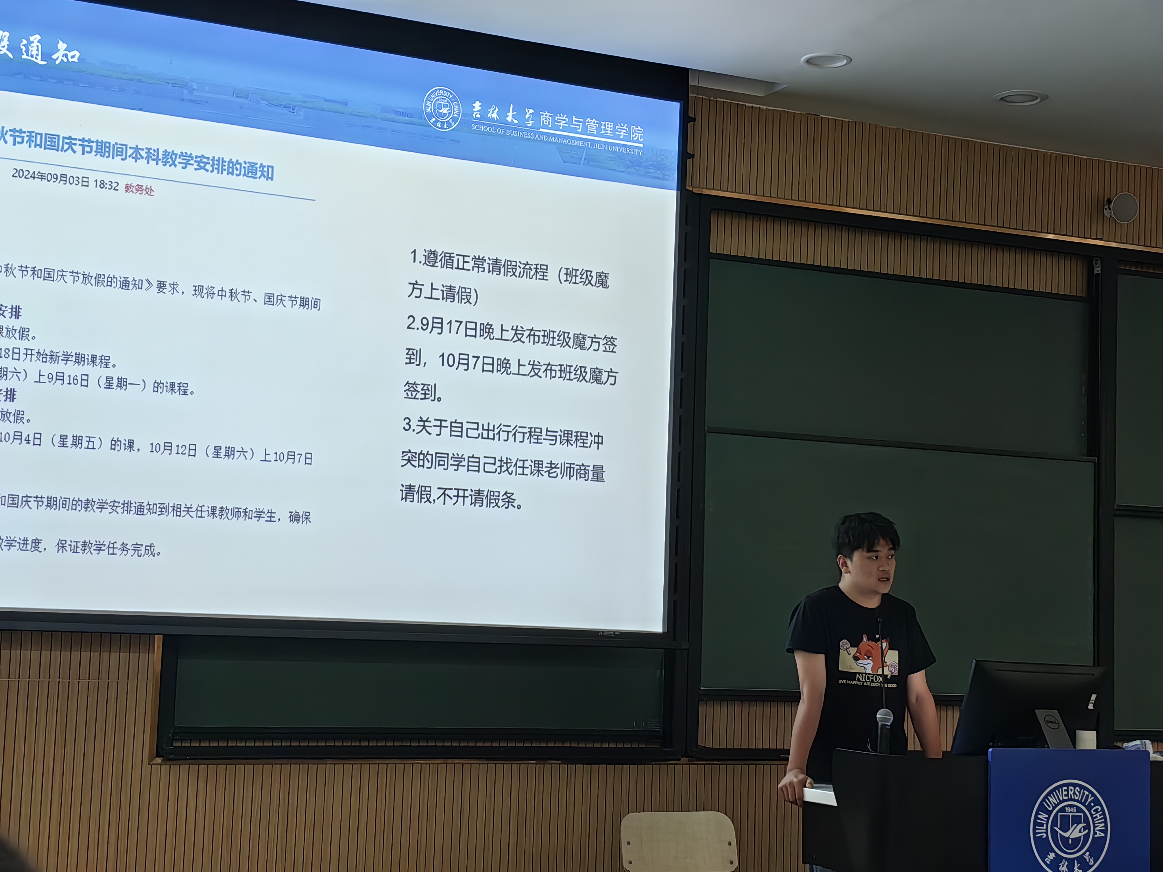 李帅书记说,学业是每位学生的首要任务,同学们应当端正学习态度,全力以赴;不仅要注重学习质量,还要追求学习效率,把每一次学习都当作是对自己知识和能力的投资。他鼓励同学们遇到困难时,要有毅力与决心去克服它们,以提高自我解决问题的能力。李帅书记的殷殷嘱托与亲切关怀,让同学们对大学生活与学习有了更深刻的认识与更清晰的规划。随后,罗小杰老师对学生日常管理和中秋国庆期间放假通知进行了说明,强调了寝室安全、请假流程以及学校对于心理咨询的相关安排;最后,刘翔宇老师对评奖评优、保研加分进行了深入解读,并鼓励同学们积极参加科研竞赛以及各类文体活动。