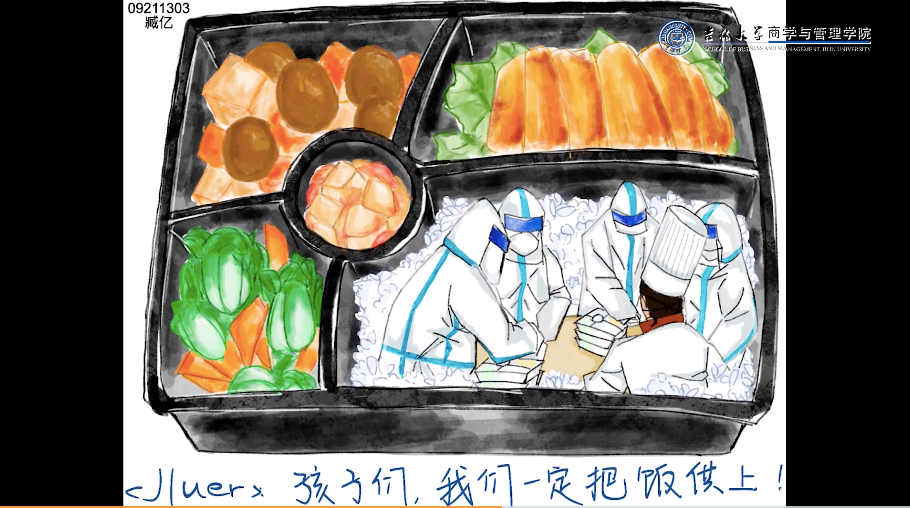 活动由信息管理系邓君主任策划,秉持疫情防控与封寝期间切实做好对学生“关心关爱”的初衷,积极响应校院防疫政策,有效提振师生抗疫信心,适时纾困学生封寝心态,用笔尖与色彩讴歌使命担当,彰显家国情怀。同学们踊跃创作,积极投稿,共计16名本科生与研究生参与绘画与后期视频制作,上交作品共29幅。一幅幅纪实画面描摹与重现了学院上下一心抗疫、振奋人心的情景,包括赵军书记、李北伟常务副院长、马腾副书记、李帅副书记、各位研究生与本科生辅导员和学生志愿者群体驻校抗疫、搬运物资等真实场景。此外还包括了数幅自由创作的艺术作品,一句“我们一定会把饭供上”感人心脾,一句“谢谢辛苦了”的标语温暖“大白”的心;一句“疫情特殊期间我得照顾好他们”热泪盈眶……画展整体风格主要采用令人身心愉悦的轻松漫画形式,深深地表达出同学们对医护人员、工作人员、驻校抗疫老师以及学生志愿者们无私奉献的感谢和敬意。最终,画展以小视频形式在微信视频号发布,受到了大家的一致好评与热烈喜爱,获得了广泛的关注与转发,具有一定的院内外、校内外影响力。