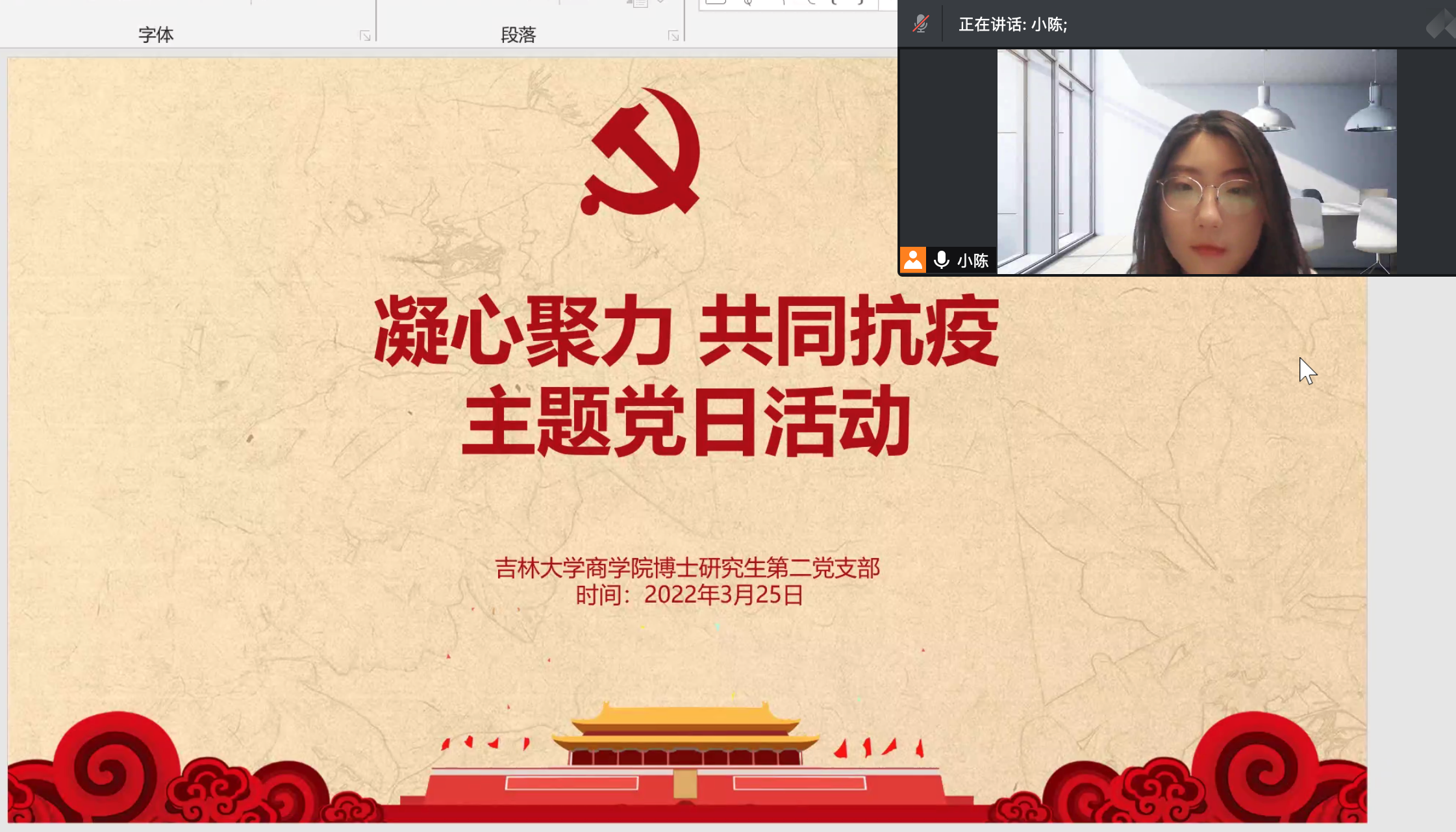 本次党日活动主要分为三个流程,首先由支部书记陈婉莹同志对3月13日封寝以来的情况与工作进行了梳理与说明,组织大家观看青春吉大视频号发布视频“Porcore