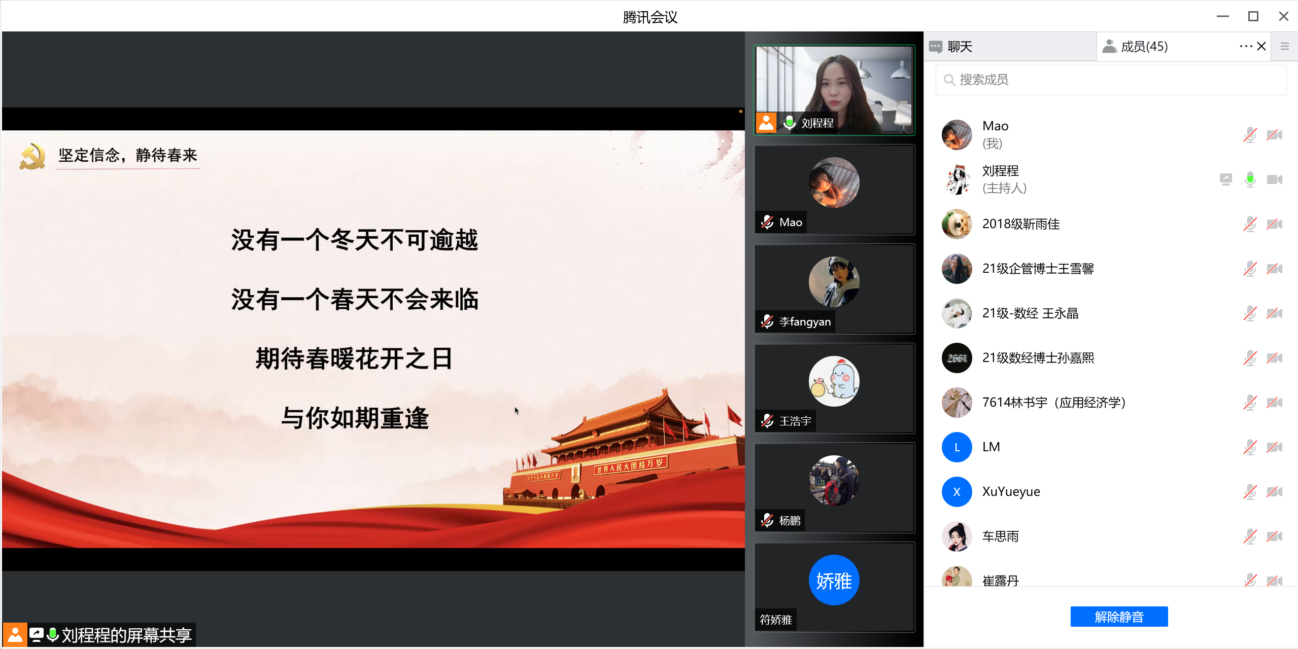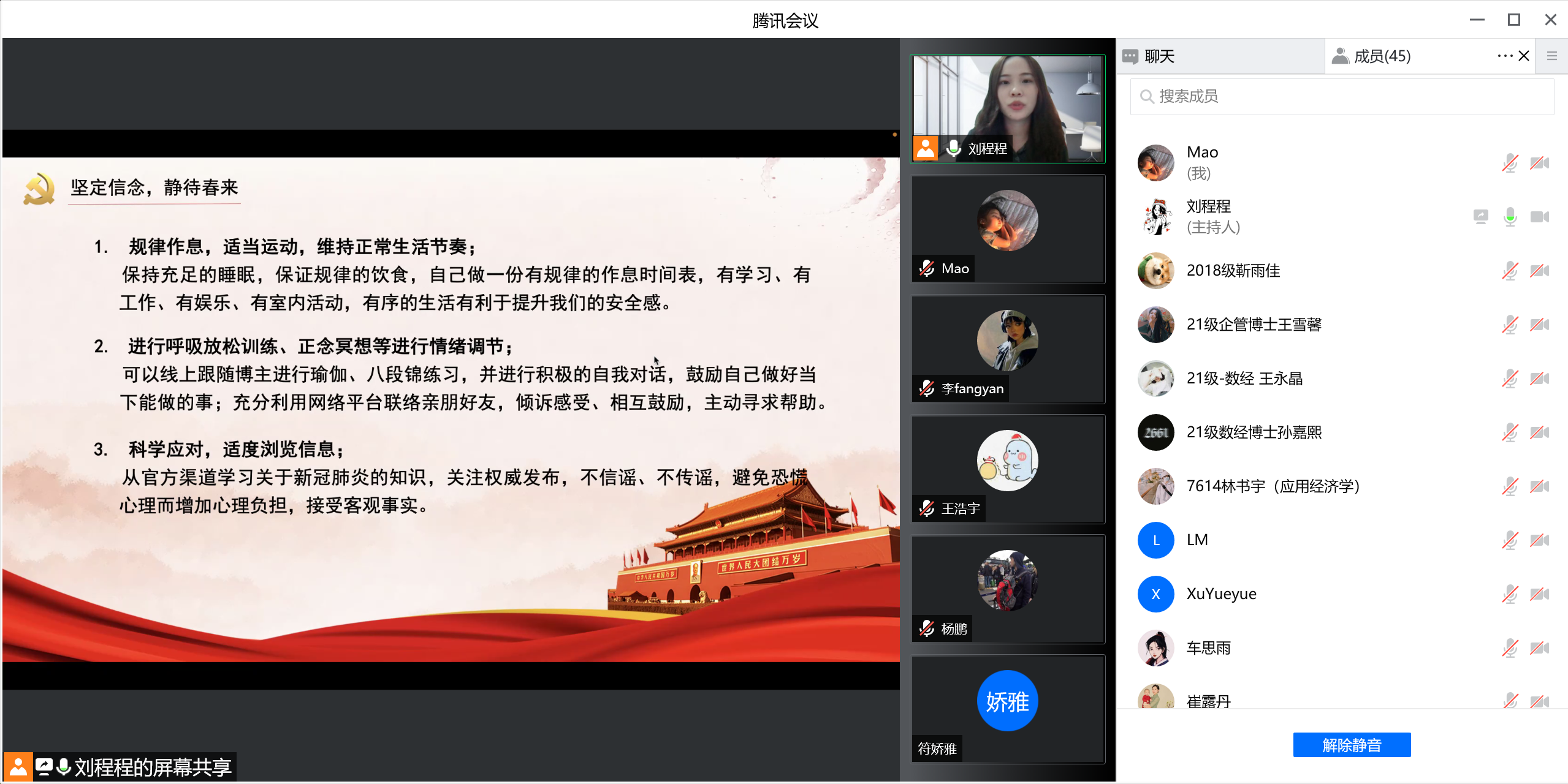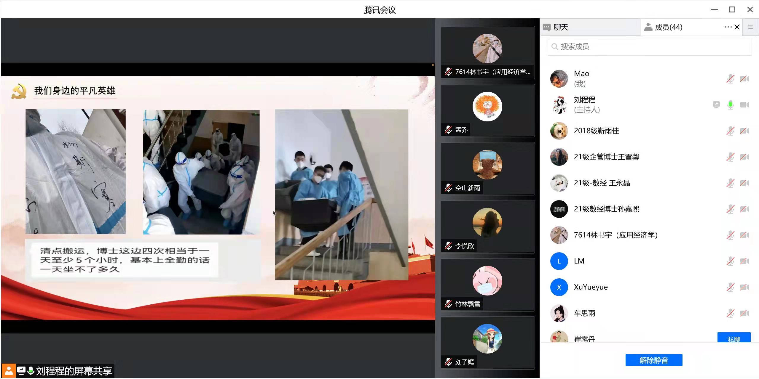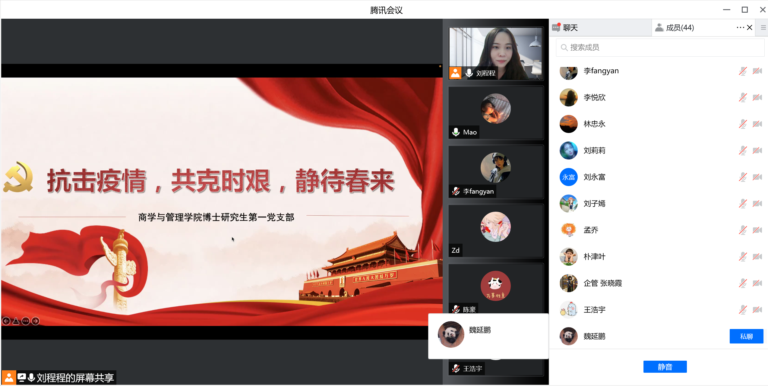 博士研究生第一党支部召开“抗击疫情,共克时坚,静待春来”线上主题党日活动。会议由党支部书记刘程程同志主持,刘欣苗同志与谢敬轩同志记录,支部有44名党员和团员共同参加。