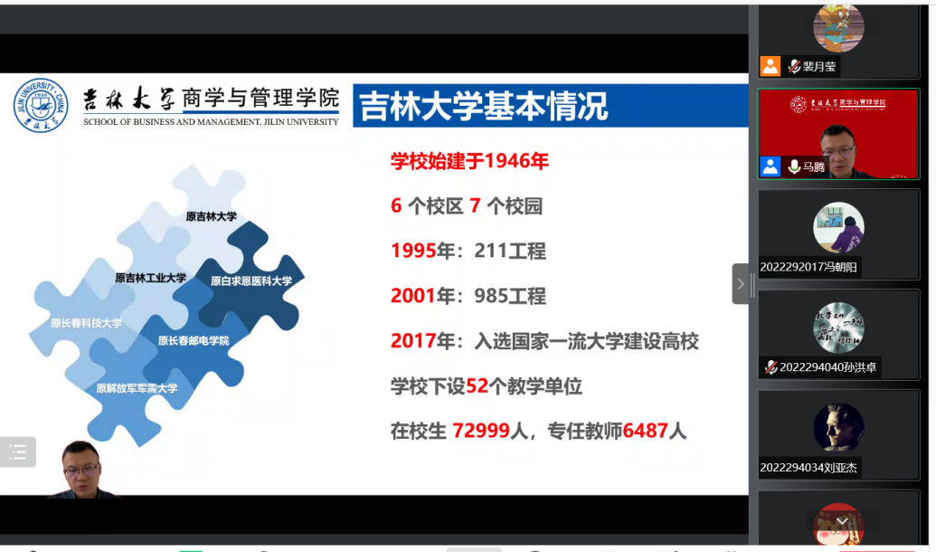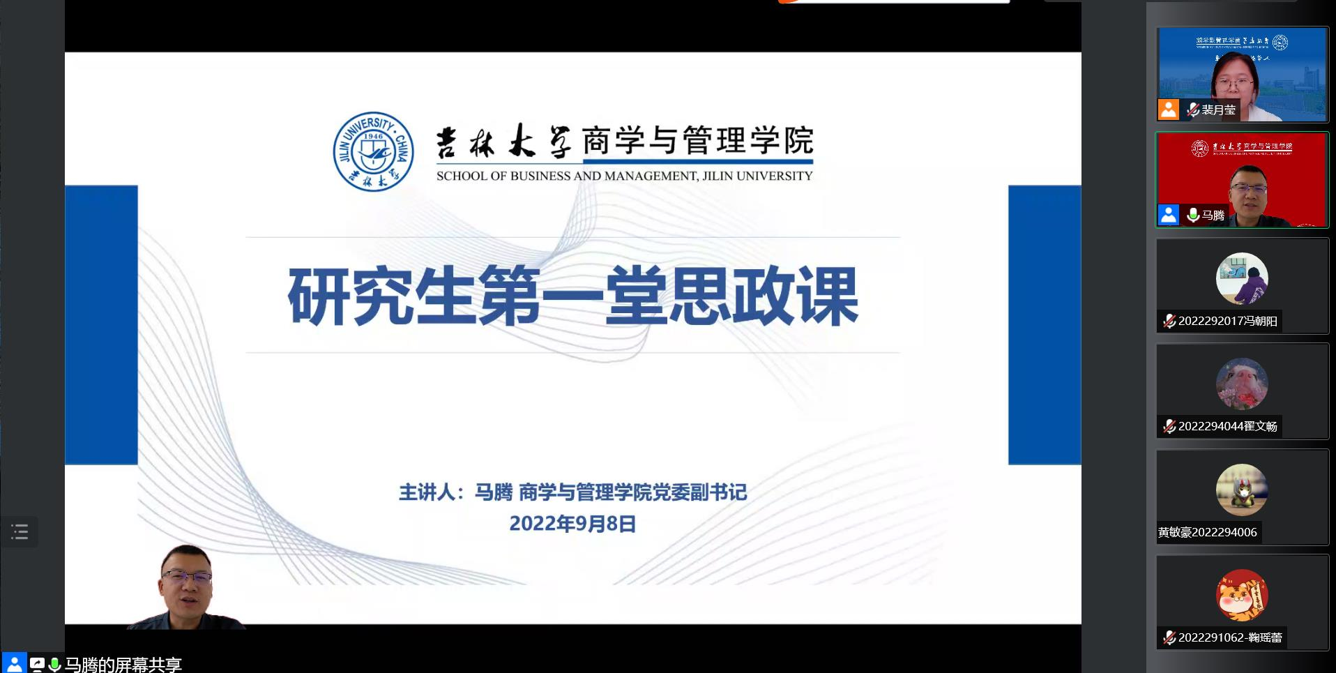 党委副书记马腾老师于线上为新生主讲第一堂思政课,研究生辅导员裴月莹老师主持会议,全体2022级研究生参会。