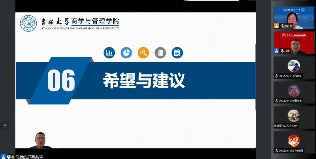 会议伊始,马腾老师对全体2022级研究生新生的到来表示热烈欢迎。随后,马腾老师从上半年的抗疫经历说起,用详实的数据和鲜活的案例为大家讲述了抗疫期间我们身边发生的真实故事,包括驻楼老师和学生志愿者的日常工作等。大家不仅从中感受到了抗疫的艰辛,还有老师和同学们的温暖与担当。马腾老师表示,希望大家可以将抗疫期间商管学子的青年担当和良好品格继续学习和传承下去。