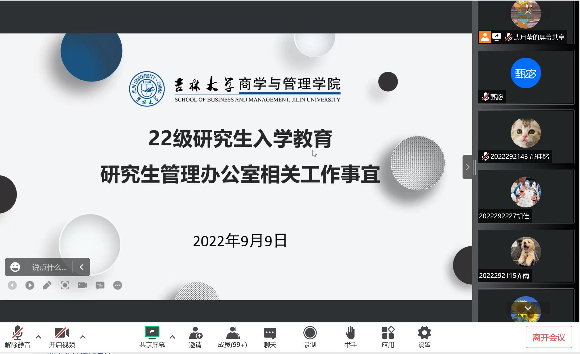 会议开始,甄老师对研究生管理工作的具体内容展开了详细说明,包括研究生学籍管理、研究生请假细则、研究生奖助贷补工作、研究生医疗保障制度、研究生寝室管理、研究生心理健康指导工作、研究生就业工作和研究生党建工作。随后,裴老师对学院和研究生学生会的情况进行了简单介绍,同时鼓励大家积极参加学校、学院组织的各项活动。最后,甄老师强调,如果大家生活和学习中出现了问题,一定要及时和老师们进行沟通。