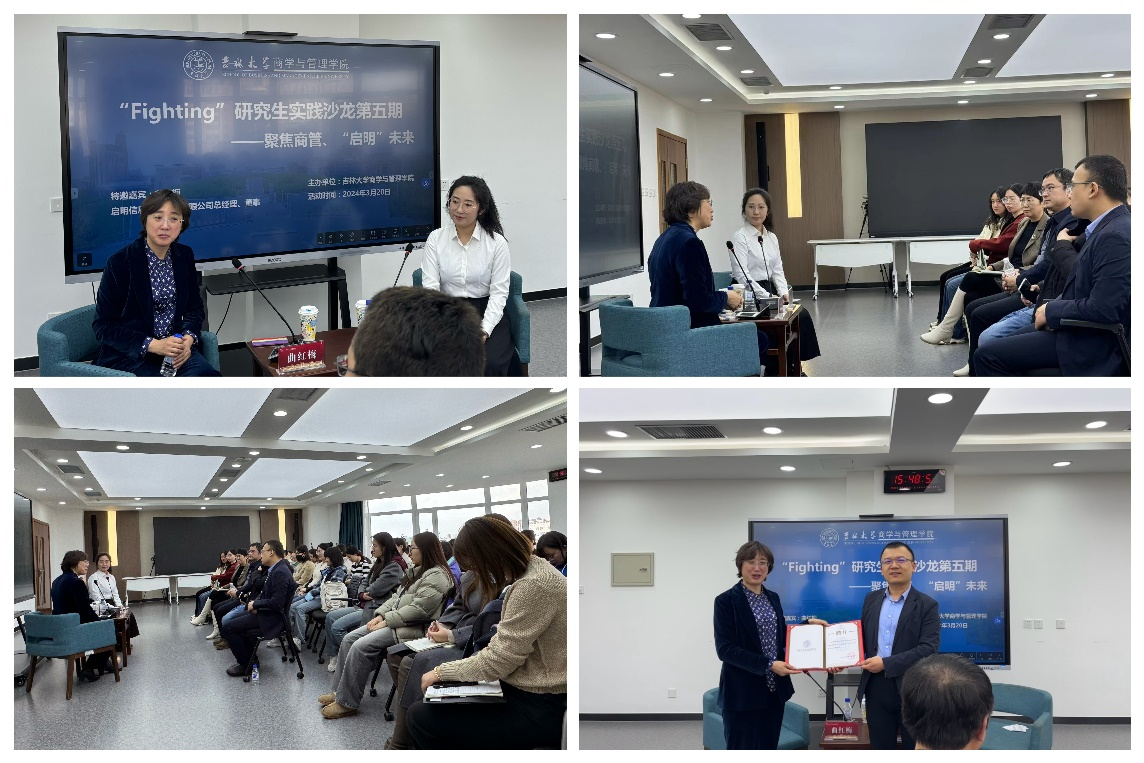 向曲红梅董事长颁发聘书,聘请曲总为“Fighting”研究生实践沙龙第五期讲师,并进行了合影留念,本次实践沙龙活动在同学们热烈的掌声中圆满结束。